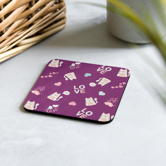 Cork-back Coaster | Adorable Cat Love Theme with Purple Background