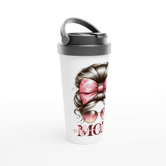 Stylish Messy Bun Mom Mug - 15oz Stainless Steel, 'Wife Mom Boss' Design, Perfect Mother's Day Gift (Pink)