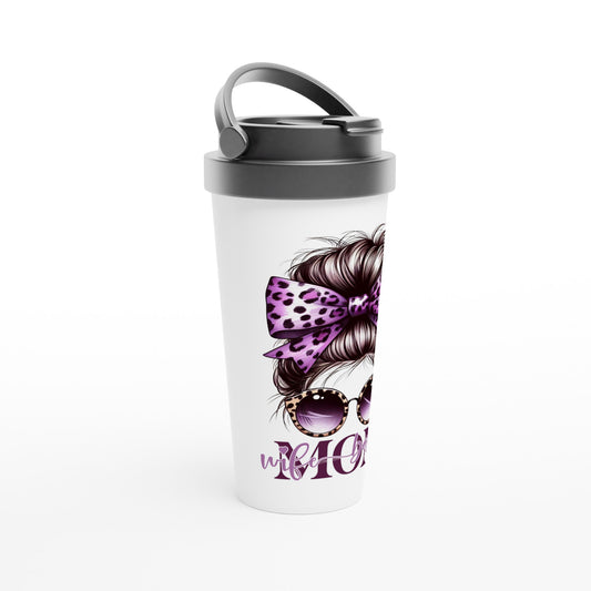 Stylish Messy Bun Mom Mug - 15oz Stainless Steel, 'Wife Mom Boss' Design, Perfect Mother's Day Gift (Purple)