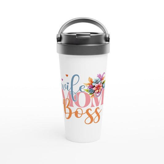 White 15oz Stainless Steel Travel Mug | Wife Mom Boss
