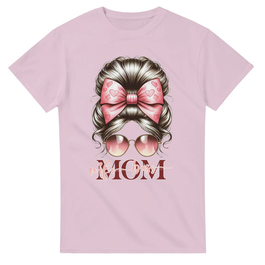 Stylish Messy Bun Mom T-Shirt - Bold Pink Heart Bow | Wife Mom Boss Tee (Pink)