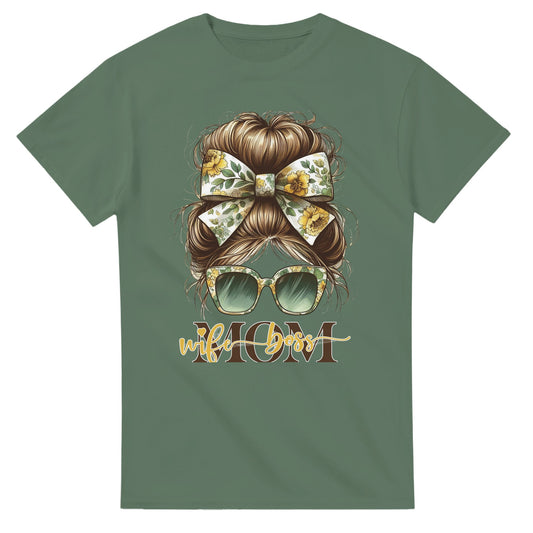 Stylish Messy Bun Mom T-Shirt - Bold Yellow Floral Bow | Wife Mom Boss Tee (Green)
