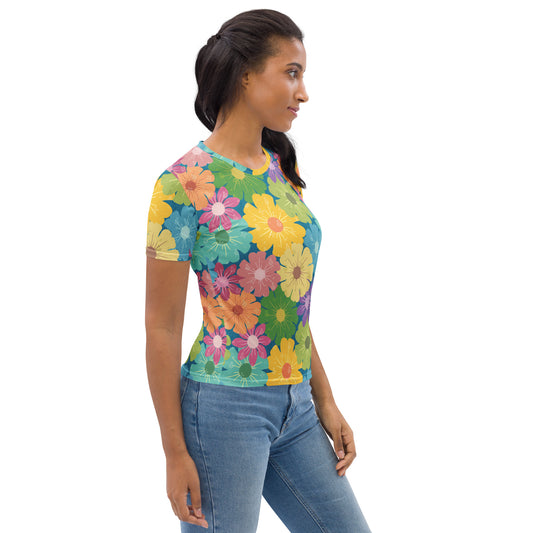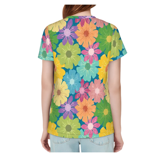 Women's Short Sleeves T-Shirt | Vibrant Daisy Floral Block Prints Design