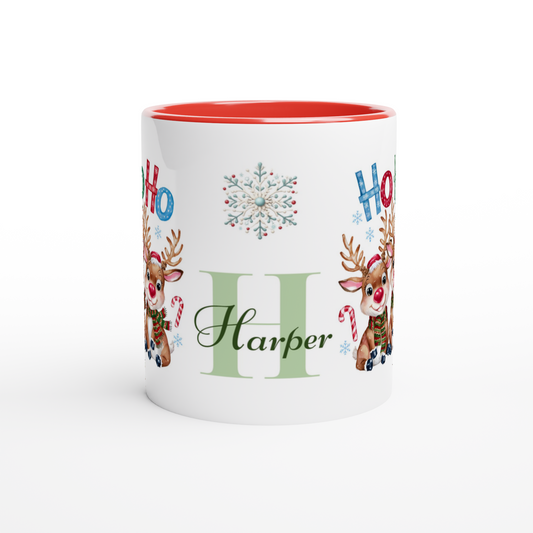 Personalized 11oz Ceramic Mug | Holiday Ho Ho Ho Red Hat Reindeers