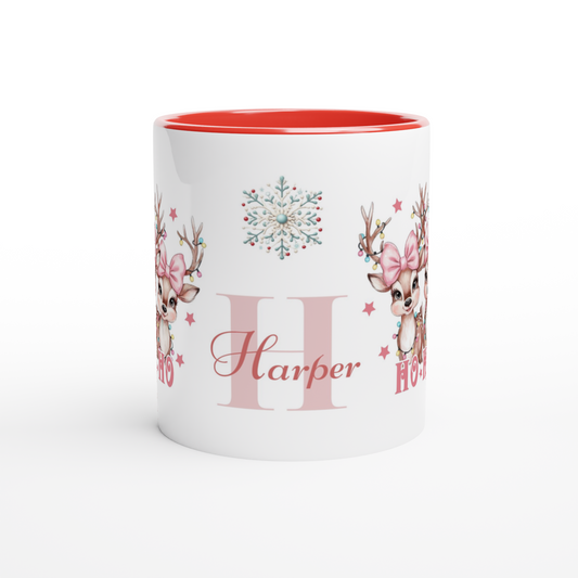 Personalized 11oz Ceramic Mug | Holiday Ho Ho Ho Pink Bow Reindeers