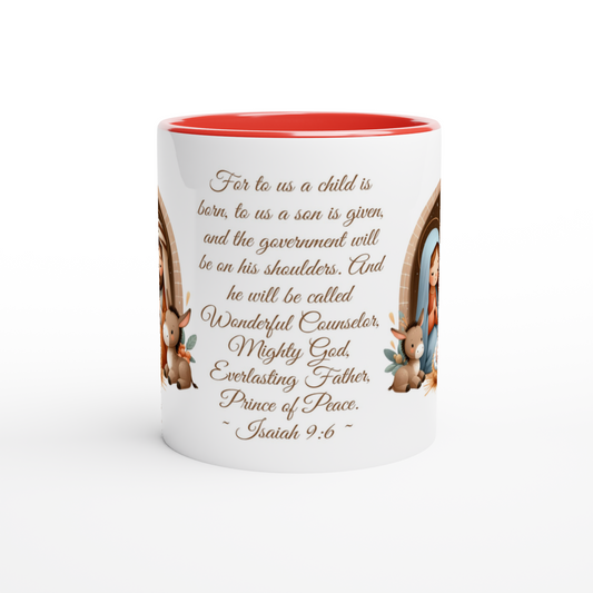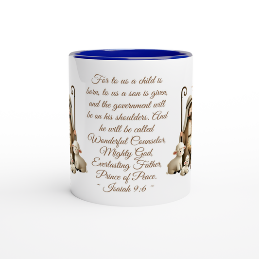Personalized 11oz Ceramic Mug | Mary Joseph and Baby Jesus Lambs Bible Verse
