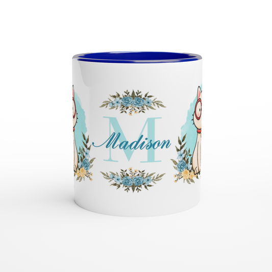 Personalized 11oz Ceramic Mug | Cute Cat Wearing Glasses Floral Themed