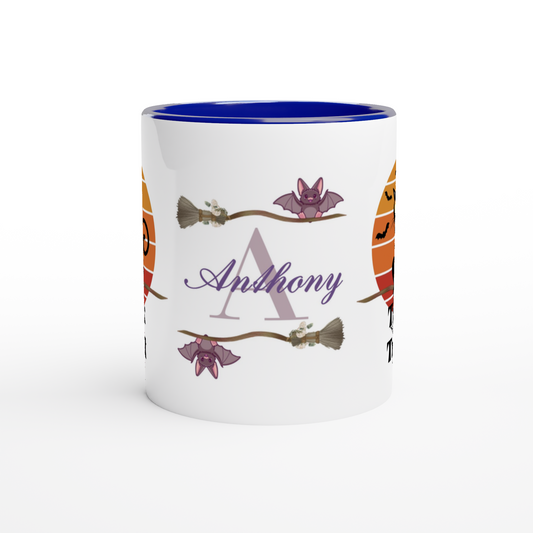 Personalized 11oz Ceramic Mug | The Witch Cat's Trick or Treat Adventure Bats
