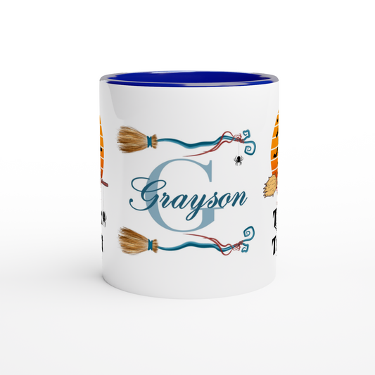 Personalized 11oz Ceramic Mug | Trick or Treat Black Cat Broom Border