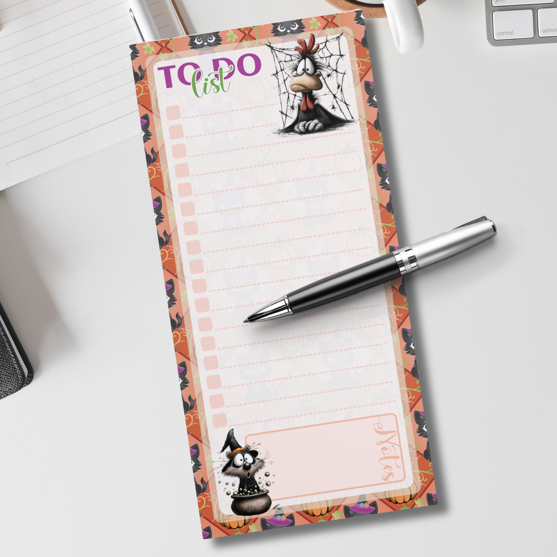 Add spooky fall charm to your day! This cute Halloween to-do list pad features a black cat and pumpkin design with checkbox grids and dotted lines for easy planning. A turkey with spider web decorates the top, and a sweet little animal in a pot accents the bottom, plus a notes box for quick reminders. Perfect autumn stationery for Halloween or Thanksgiving — fun, festive, and functional!